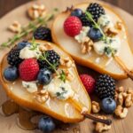 Once baked, let them cool slightly. Now comes the fun part! Evenly sprinkle your mixed berries over the warm pears, followed by crumbled blue cheese—this warmth will soften the cheese, creating a creamy delight.